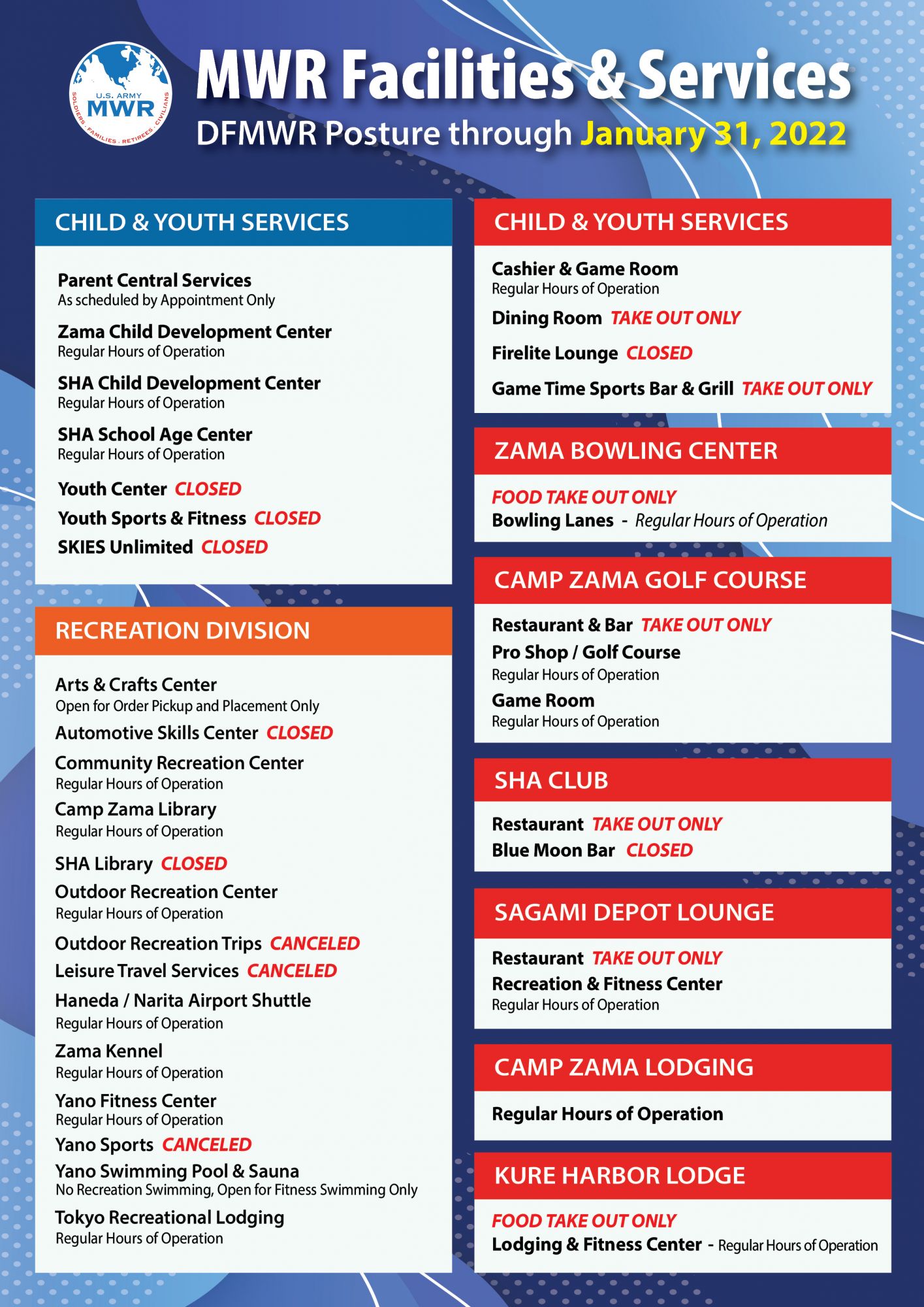 Several MWR programs that have been previously canceled are now going back to normal operations effective January 27, 2022. Thank you all for your patience.